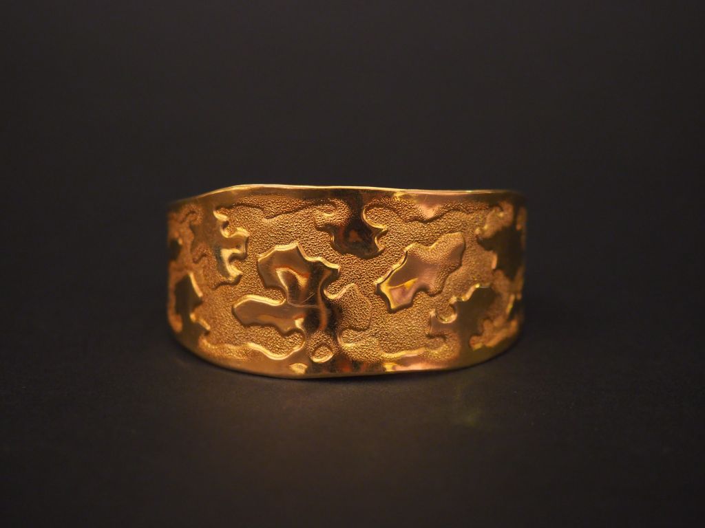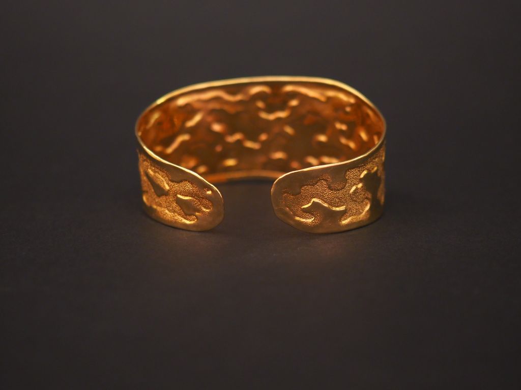 Bracelet jonc manchette en or jaune, à décor de motifs stylisés. Poids. 11,82 g