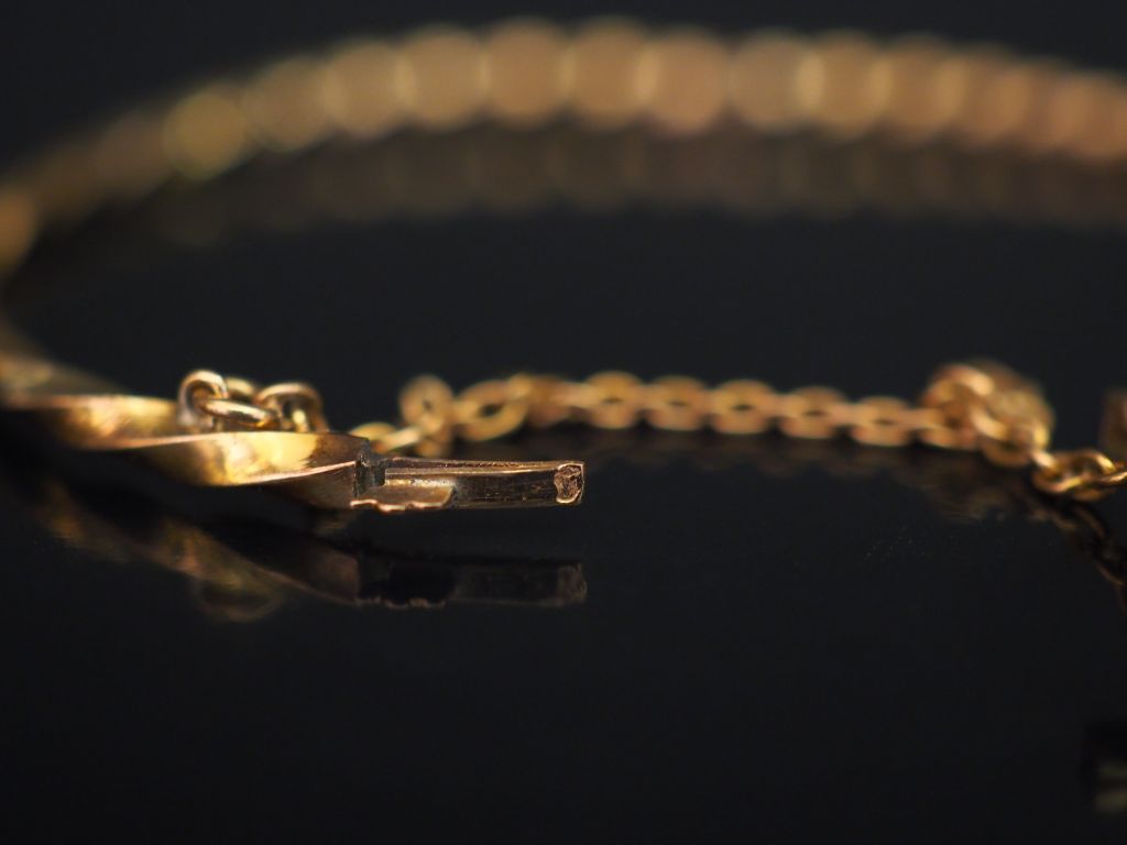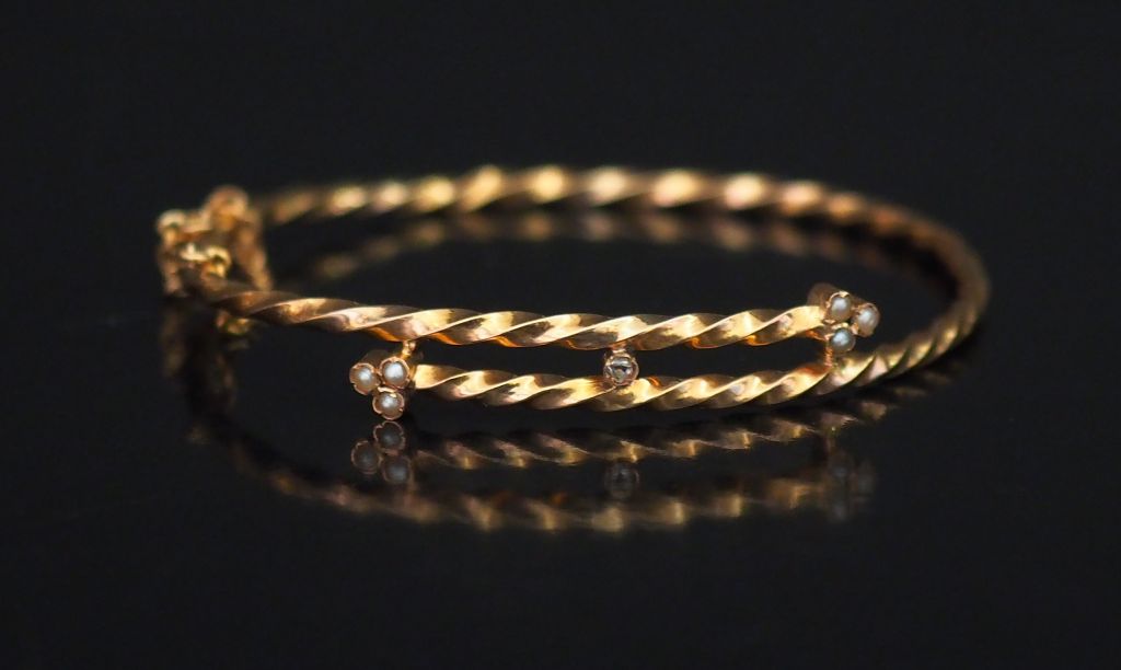 Bracelet jonc Napoléon III en or jaune torsadé, à décor sur les extrêmités de deux petits fleurs serties de perles et d'un diamant taillé en rose en son centre. Chainette de sécurité. 4,8 x 5,4 cm Poids tel. 4,22 g