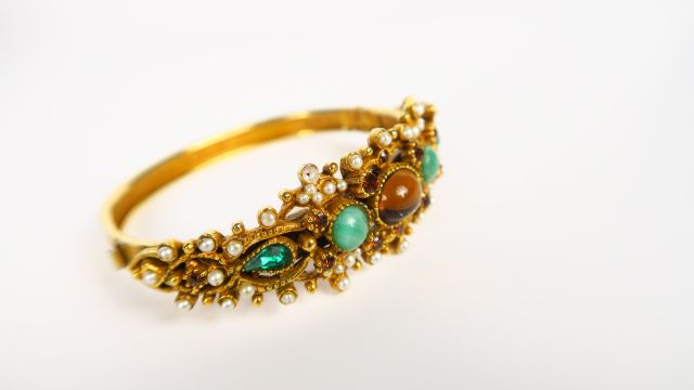 Bracelet jonc orné de pierres de couleurs et de perles baroques. Monture en métal doré. (fermoir bloqué)