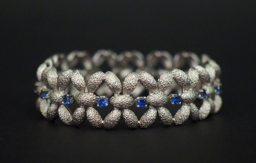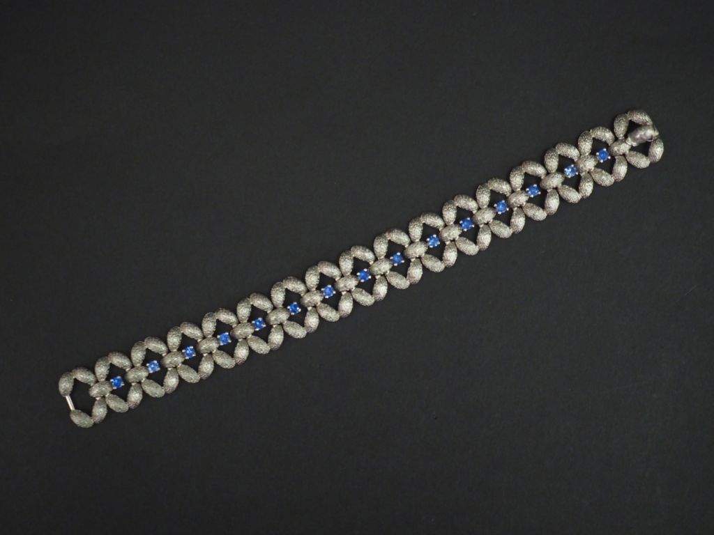 Bracelet manchette articulé en or blanc, à décor de croisillons sertis de quinze petits saphirs. Long. 18 cm Poids tel. 40,98 g
