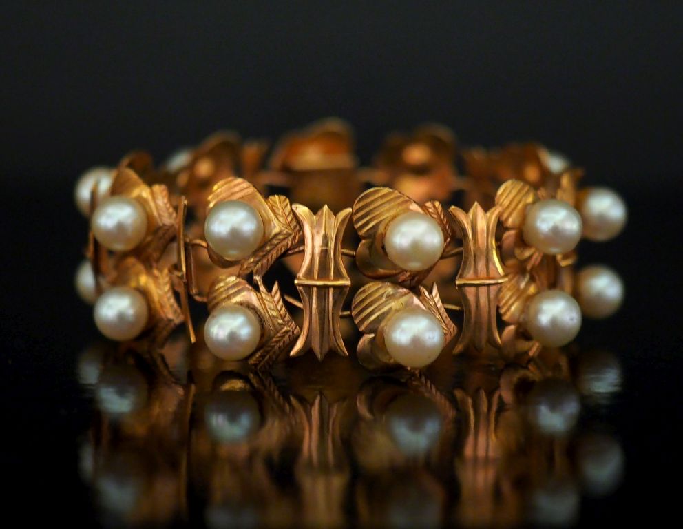 Bracelet manchette articulé en or jaune 750, à décor de cœurs sertis de perles blanches. Chainette de sécurité. Larg. 2 cm Poids tel. 26,76 g
