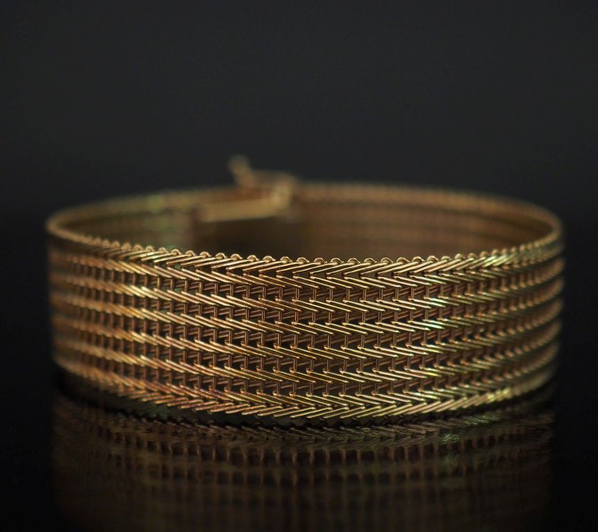 Bracelet manchette en or jaune 585, maille plate ajourée et tressée. Larg. 1,8 cm Long. 19,2 cm Poids. 30,12 g