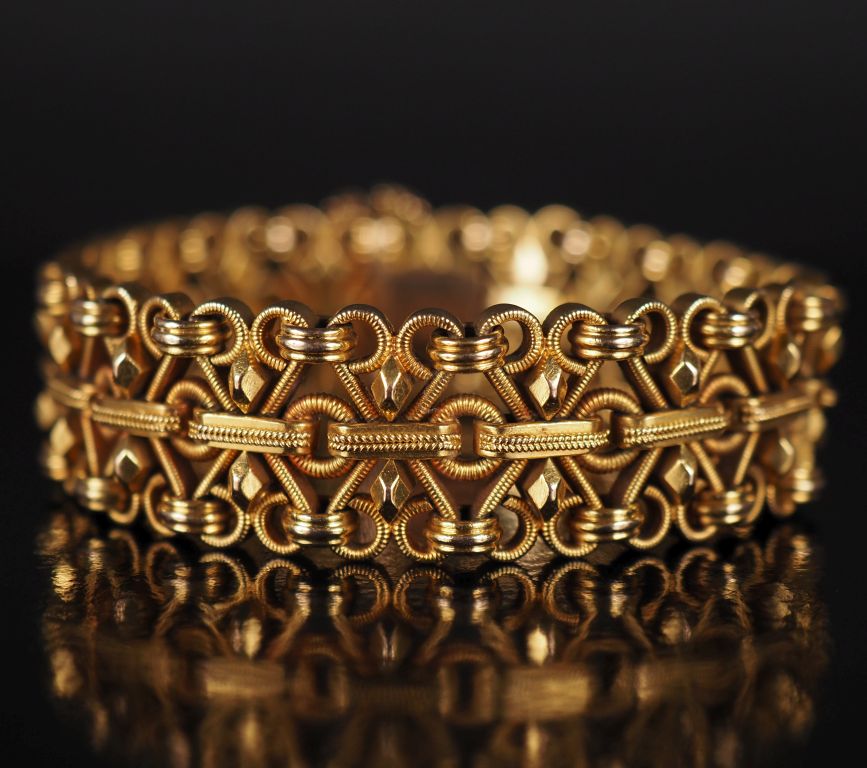Bracelet manchette en or jaune 750, maille fantaisie ajourée. Chainette de sécurité. Larg. 1,8 cm Diam. 5,5 cm environ. Poids. 59,28 g