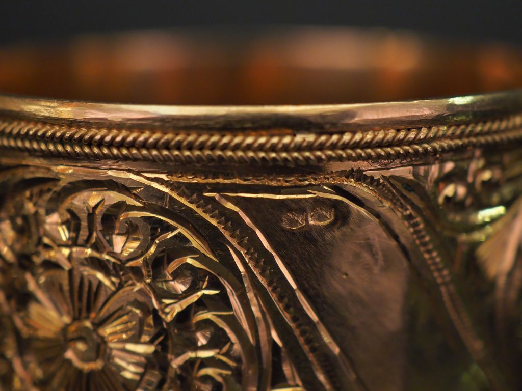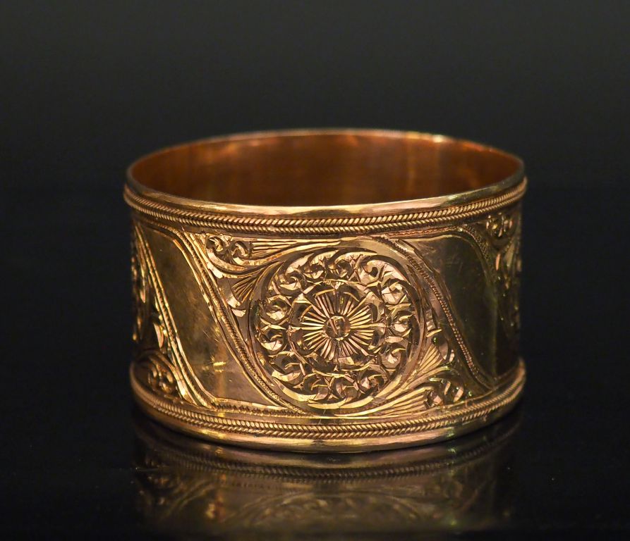 Bracelet manchette en or jaune, à décor gravé de rosaces. Diam. 6,7 cm Poids. 86,79 g