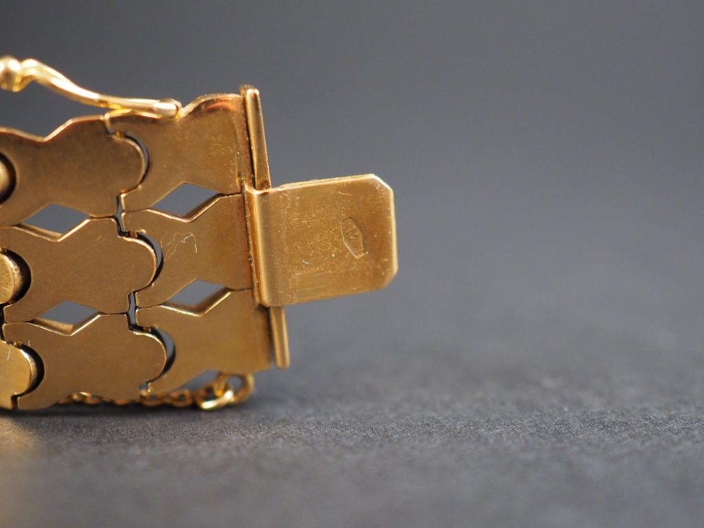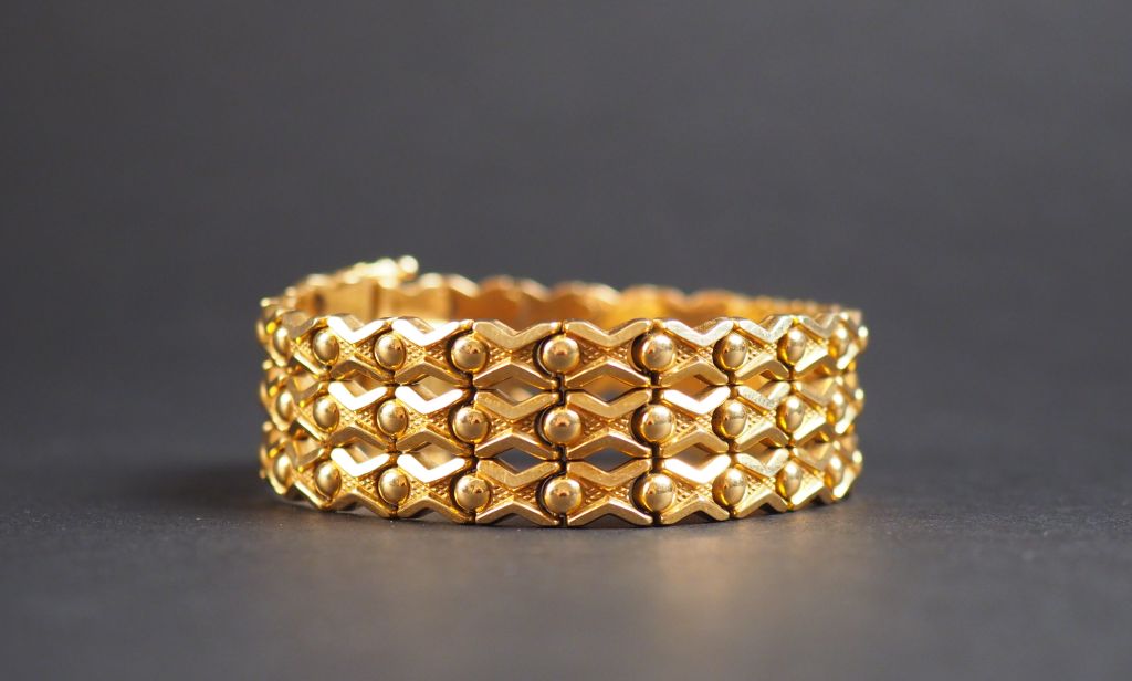Bracelet manchette en or jaune, maille articulée. Poids. 41,32 g