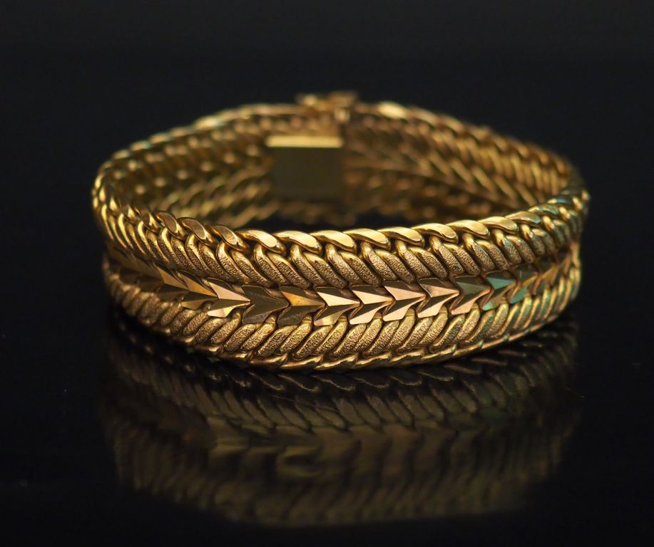 Bracelet manchette en or jaune, maille plate tressée. Long. 18,6 cm Poids. 33 g