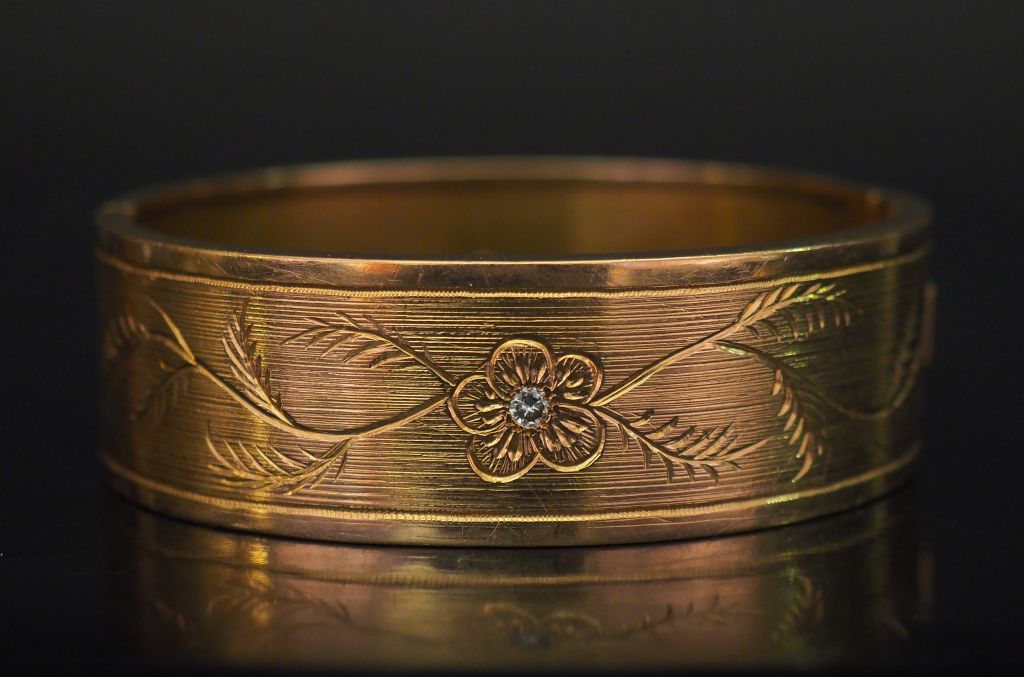 Bracelet manchette rigide Napoléon III en or jaune, à décor gravé de branchage fleuri et serti de deux diamants taillés en rose. Larg. 2,3 cm Dim. intérieur : 5,5 x 6,3 cm Poids tel. 75,92 g