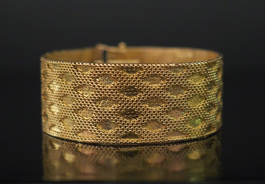 Bracelet manchette souple en or jaune, maille plate, à décor de losanges. Long. 18,3 cm Larg. 2,5 cm Poids. 55,56 g