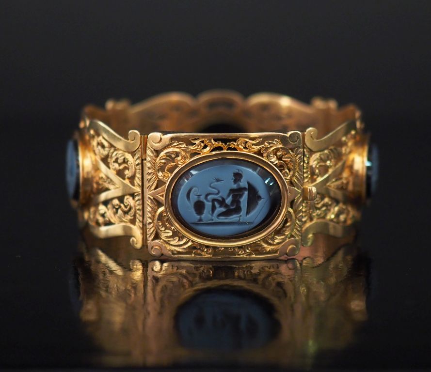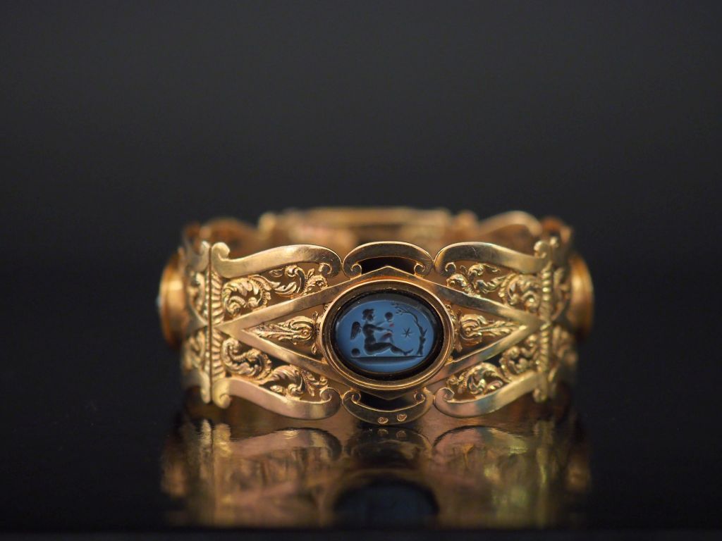Bracelet manchette XIXème en or jaune, à décor ajouré de rinceaux feuillagés et agrémenté de quatre intailles en agate d'après l'antique. Poinçon tête de bélier. Larg. 2,2 cm Diam. 4,8 cm Poids tel. 29,17 g Dans un écrin marqué Darche. (une intaille fendue)
