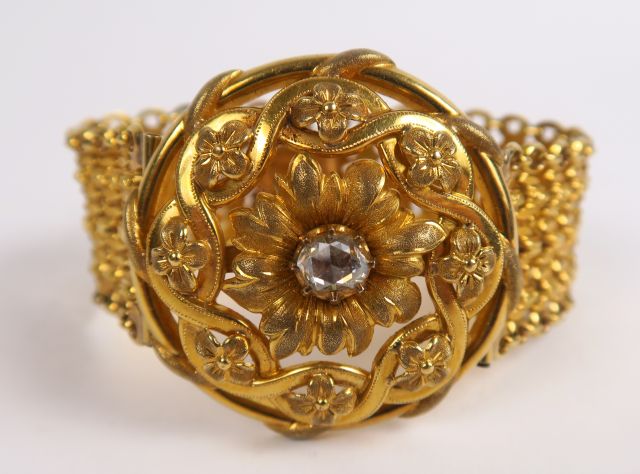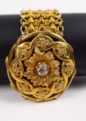 Bracelet Napoléon III en or ajouré à décor de motifs floraux, orné en son centre d'un diamant taillé en rose. Poids tel : 22 g