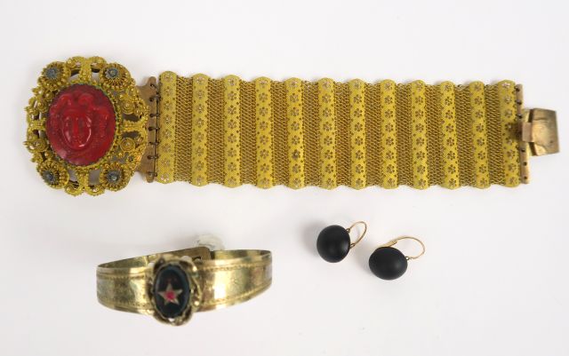 Bracelet Napoléon III en pomponne, médaille ajourée orné d’un camée figurant une tête de personnage à l’antique .On y joint une paire de boucles d’oreilles ornées de perles de jais, monture en or, et un bracelet jonc en vermeil, jaspe sanguin serti d’un motif en étoile rehaussé d’une pierre rouge en médaillon. Poids tel du bracelet en vermeil : 7.2 g