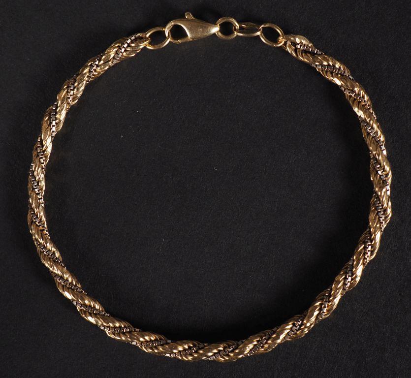 Bracelet souple deux tons d'or 750, mailles vénitienne et ronde entrelacées. Long. 19 cm Poids. 5,65 g