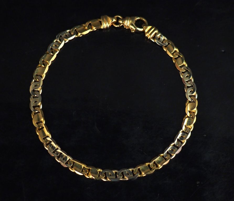 Bracelet souple deux tons d'or, maille plate ajourée. Long. 21,5 cm Poids. 14,99 g