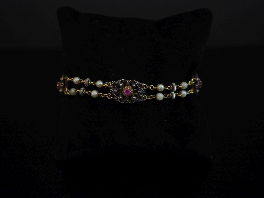 Bracelet souple en or jaune 750 et argent, composé de maillons rectangulaires à décor ajouré de rinceaux et agémentés en leur centre d'une pierre rose reliés entre eux par deux rangs ornés de perles blanches et d'un motif godronné. Chainette de sécurité. Larg. 1,3 cm Poids tel. 20,13 g