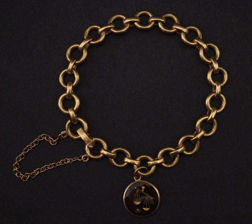 Bracelet souple en or jaune 750, maillons ronds et ovales plats alternés, agrémenté d'une pendeloque à décor gravé de balance. Chainette de sécurité en or16,44 g jaune 750. Poids tel.