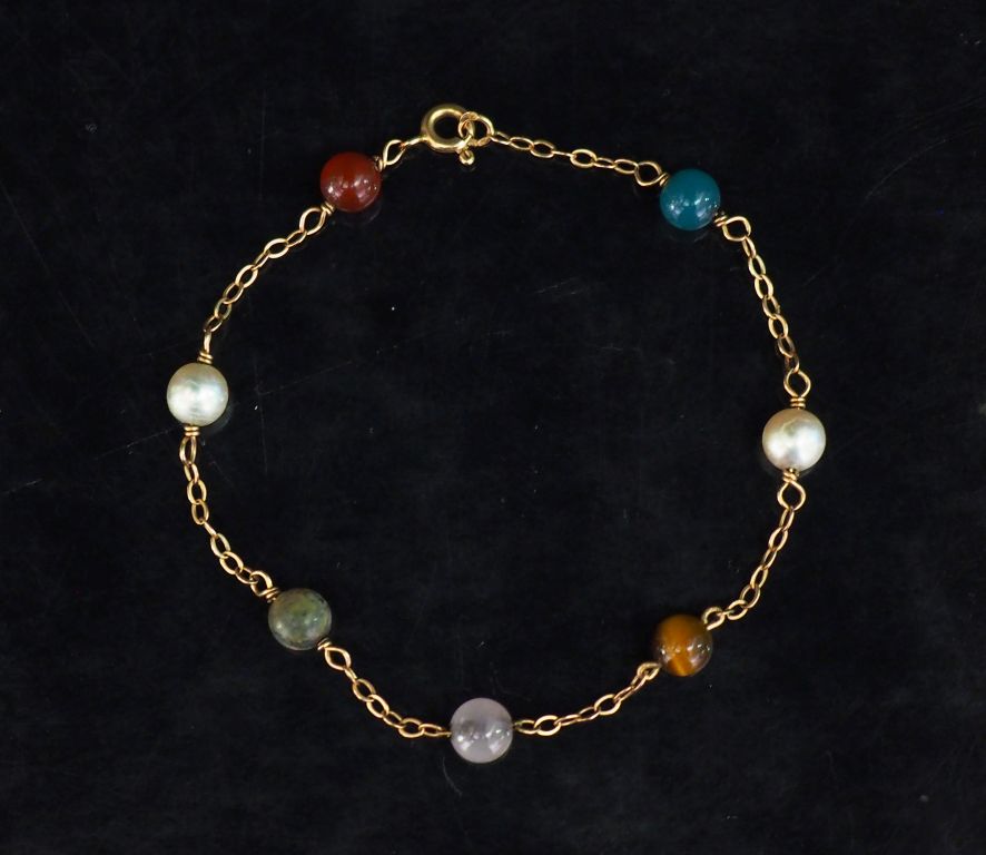 Bracelet souple en or jaune, perles blanches et pierres dures. Long. 19,5 cm Poids tel. 3,48 g