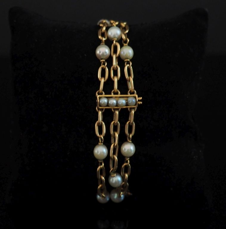 Bracelet souple triple rangs en or jaune 750, agrémenté de perles blanches. Larg. 1,7 cm Long. 19 cm Poids tel. 29,51 g