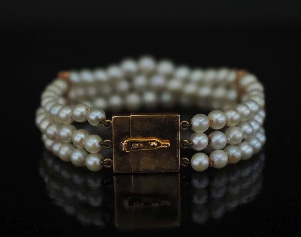 Bracelet trois rangs de perles blanches agrémenté de deux maillons en or jaune 585. Fermoir en or jaune 585. Long. 16,5 cm Poids tel. 16,11 g