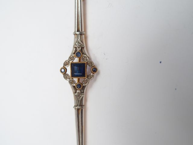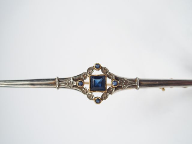 Broche Art Déco en or jaune et blanc, ornée d'un saphir central entouré de roses et de 4 petits saphirs. 7,5 cm Poids tel : 3,81 gr