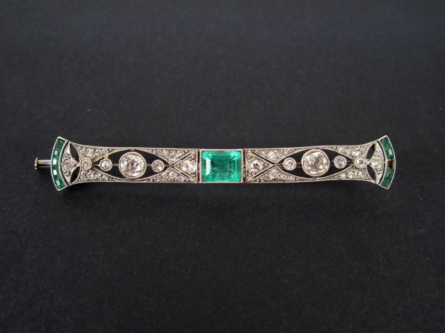 Broche barette Art déco monture platine, pavage de diamants taille ancienne dont 2 principaux de 0,30cts environ, et rehaussée d'une émeraude de 1,30cts environ (manque). Poids tel: 8,2gr