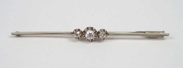 Broche barette en or blanc ornée en son centre de 3 diamants taille ancienne: 0,18ct environ, 0,07ct environ et 0,04ct environ. 7cm Poids tel: 4,3gr