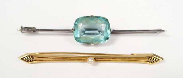 Broche barette en or jaune ornée d'une perle. Poids tel: 2,5gr On y joint une broche barette monture argent ornée d'une pierre bleue.