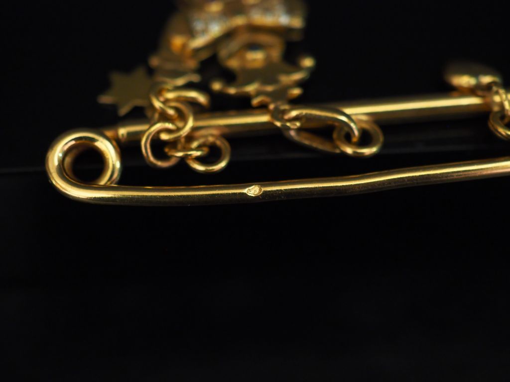Broche barrette en or jaune, à décor de trois pendeloques dont une en forme de clown articulé sertie d'un pavage de petits diamants et de pierres de couleur. Les deux autres enforme d''étoile et de cœur. Long. 5,9 cm H. du clown : 3 cm Poids tel. 13,24 g