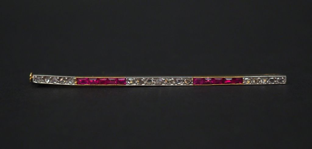 Broche barrette en or jaune, sertie de lignes de petits diamants taillés en roses et pierres roses calibrés alternées. Long. 6,6 cm Poids tel. 3,91 g