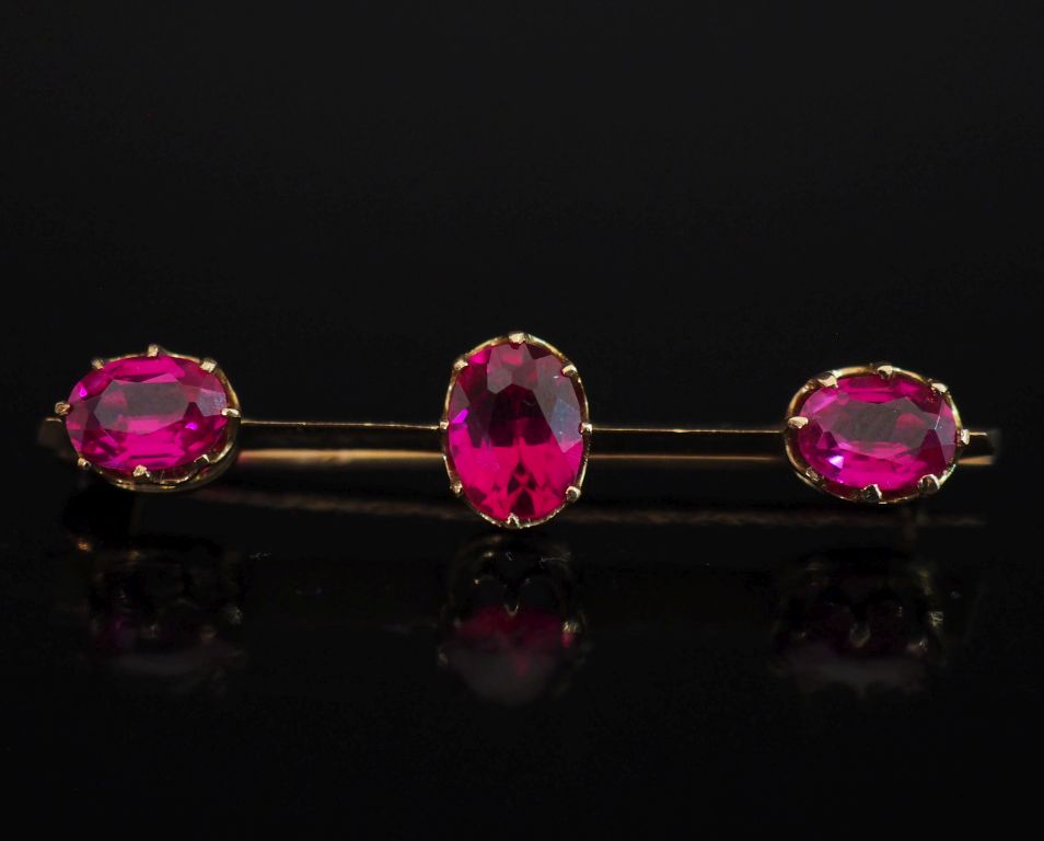 Broche barrette Napoléon III en or jaune 750, sertie de trois pierres roses. Long. 4,5 cm Poids tel. 4,92 g