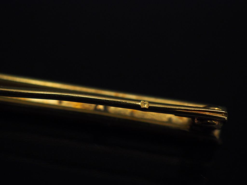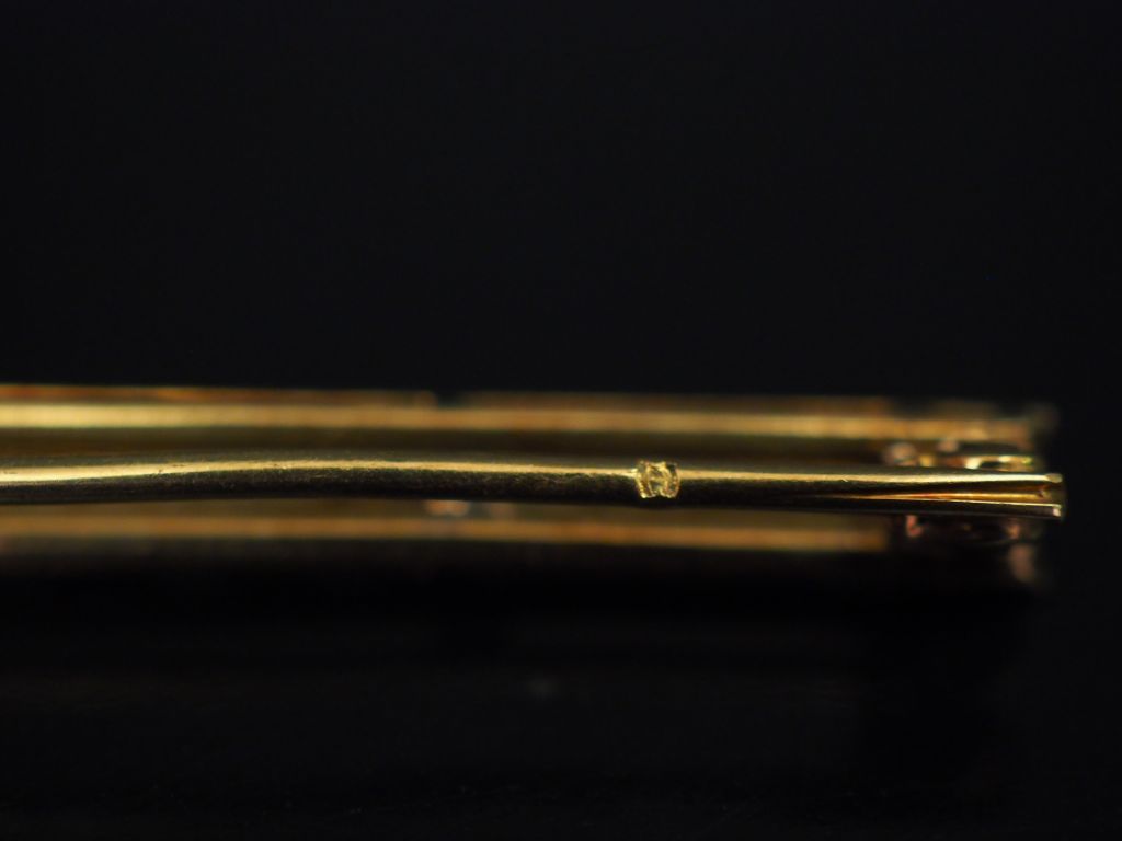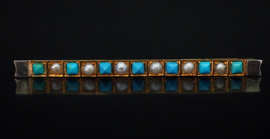 Broche barrette Napoléon III en or jaune, sertie de perles blanches et turquoises en cabochon alternés. Long. 6,5 cm Poids tel. 6,88 g (très petit accident à une perle)