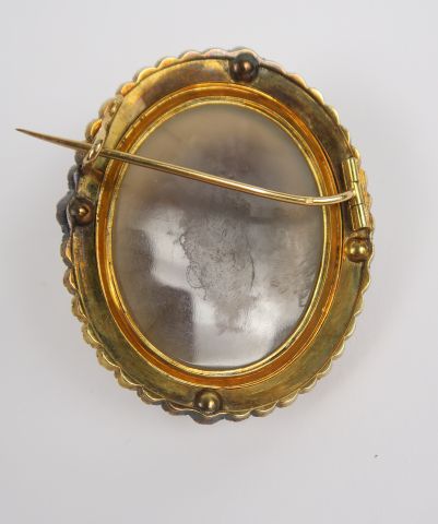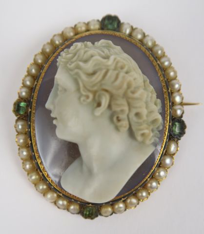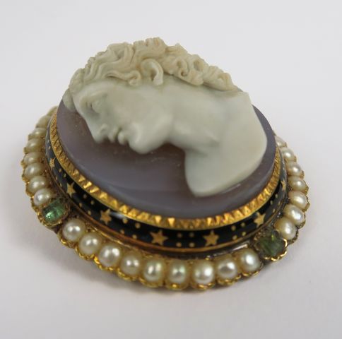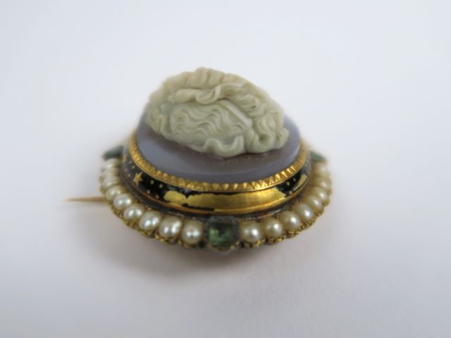 Broche camée Napoléon III sur pierre dure représentant le profil d’un personnage à l’antique. Monture en or, en partie émaillée, sertie de demi-perles et de quatre émeraudes. Poids tel : 41.8 g (quelques sauts d'émail)