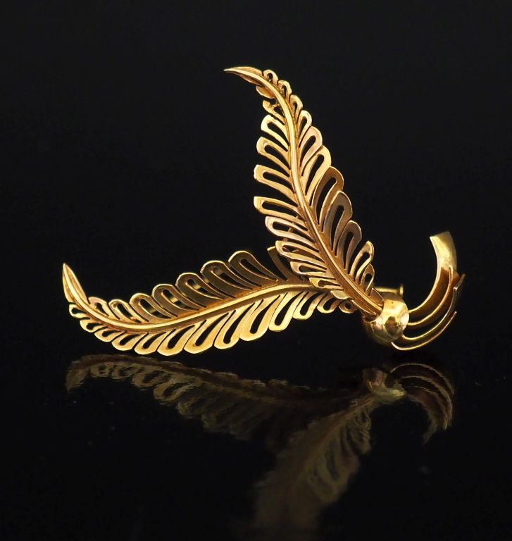 Broche de forme stylisée en or jaune 750, à décor de branchages ajourés. 5,5 x 4 cm Poids. 7,38 g