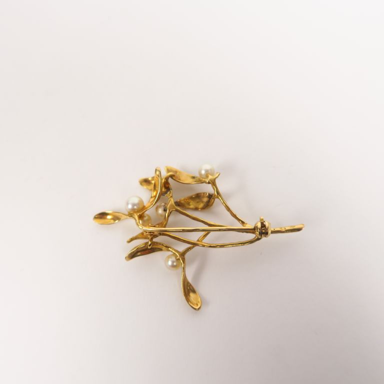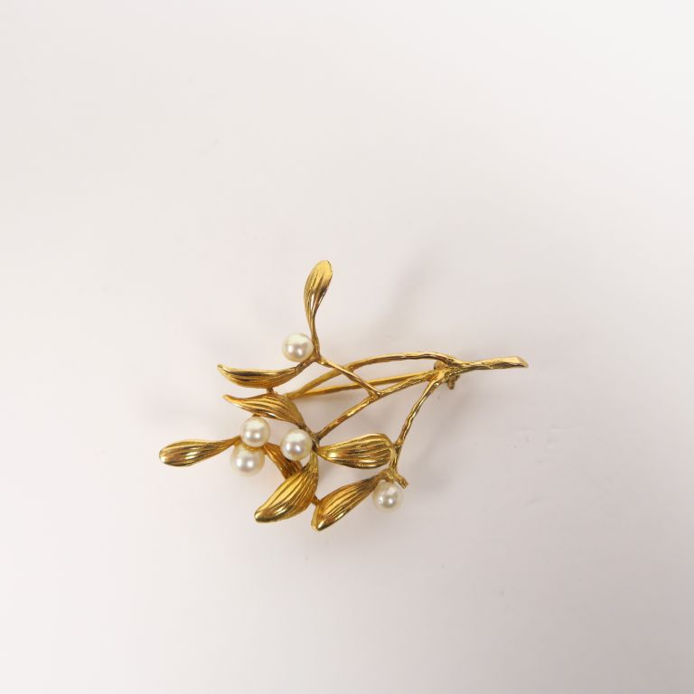 Broche de style Art Nouveau en or et perles en forme de branche de gui. Poids tel. 5,50 g