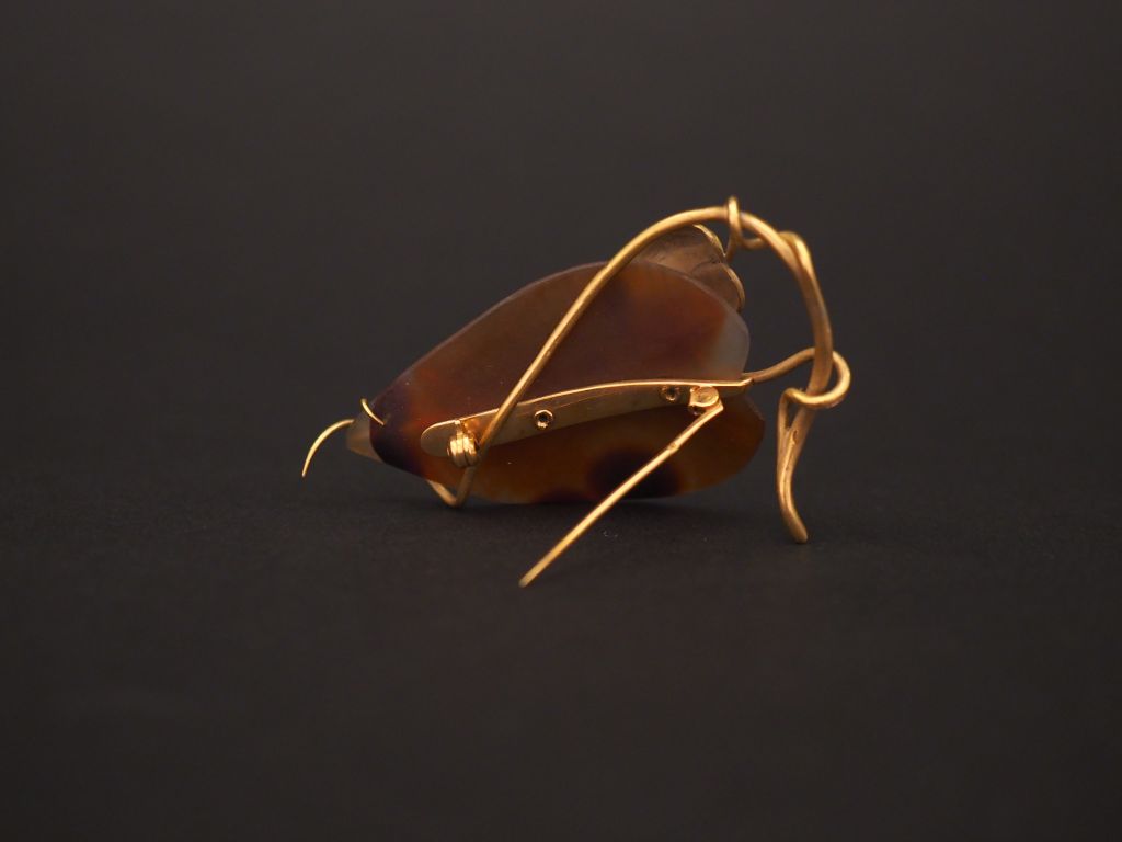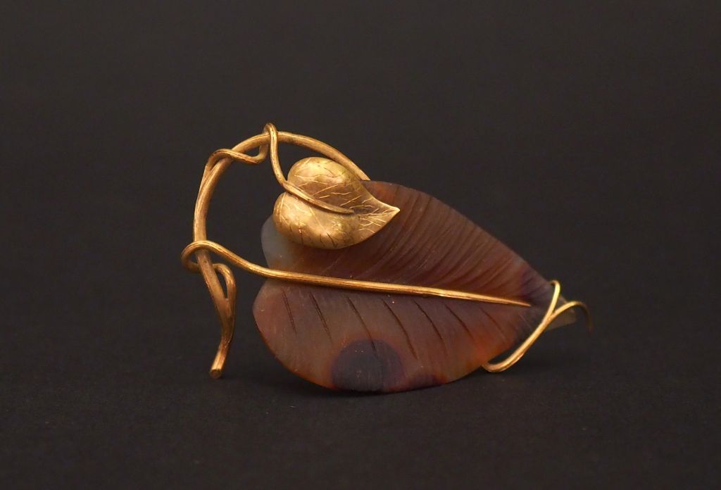 Broche de style Art Nouveau en or jaune et agate en forme de feuille. Long. 5,5 cm Poids tel. 10,07 g