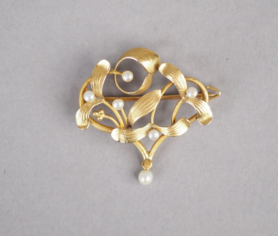 Broche de style Art Nouveau en or jaune et perles, à décor ajouré de gui. Dim. 3 x 3 cm Poids tel. 3,72 g