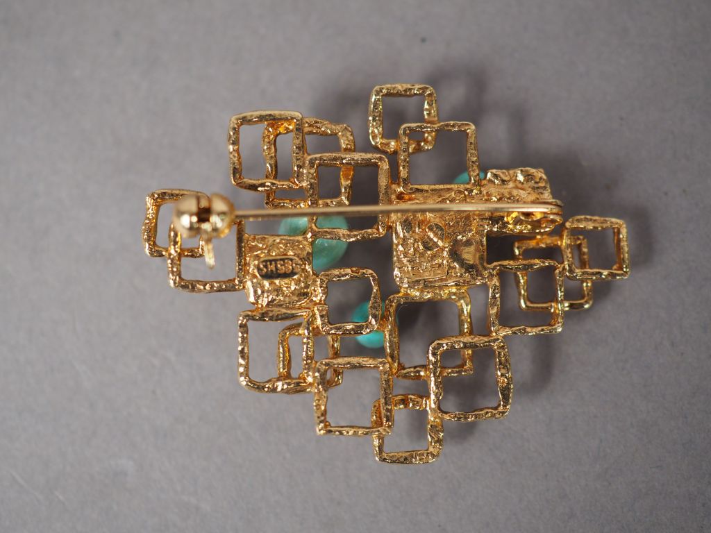 Broche de style cubiste en or jaune 9K et turquoises. Poids tel. 9,12 g