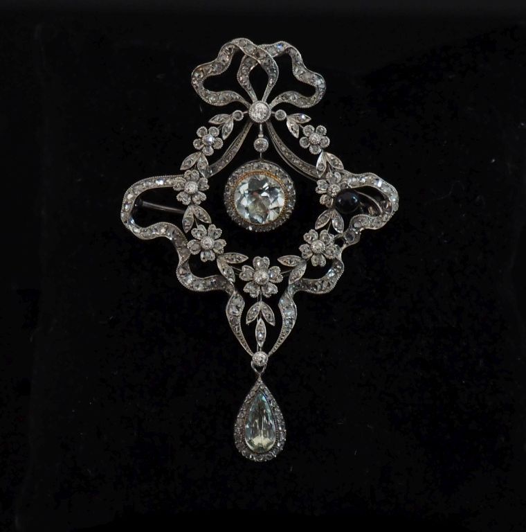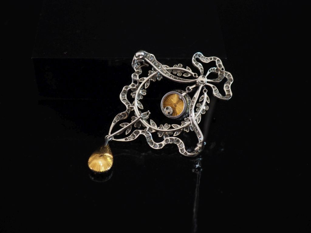 Broche de style Louis XVI en or blanc 750, à décor de nœud de ruban, couronne de fleurs et sertie de petits diamants taillés en rose. La broche est agrémentée de deux pendeloques dont les pierres centrales sont à l'imitation du diamant. 6,5 x 4,5 cm Poids tel. 20,07 g (manque)