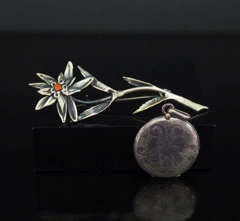 Broche en argent, en forme de fleur, le pistil à décor d'émail rouge. H. 7,3 cm Poids tel. 5,70 g On y joint un pendentif porte-photo en argent, à décor sur une face de rinceaux feuillagés et de fleurs. Diam. 2,5 cm Poids. 6,55 g