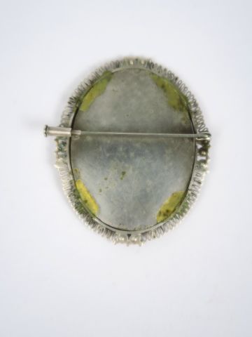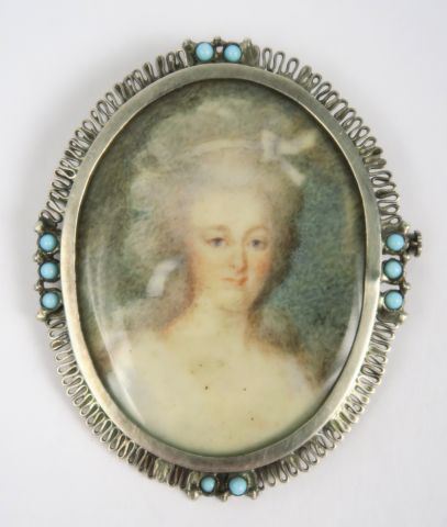 Broche en argent ornée d'une miniature figurant un portrait de femme du XVIIIe. Signée. Dimensions de la broche : 7,5 x 5,5 cm