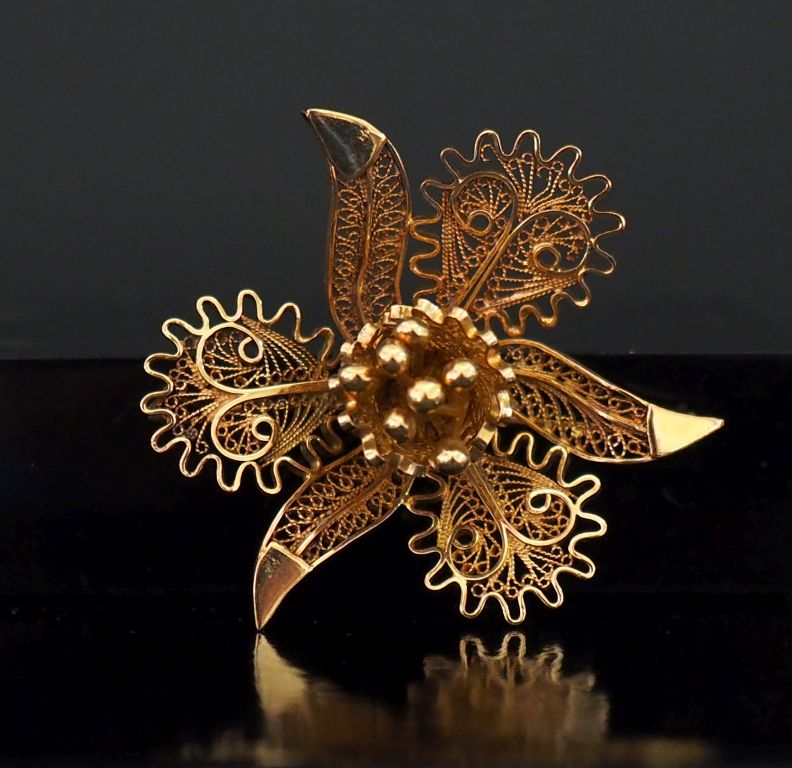 Broche en forme de fleur épanouie, à décor ajouré et filigrané. 4,2 x 4,5 cm Poids. 14,56 g (à charge de contrôle)