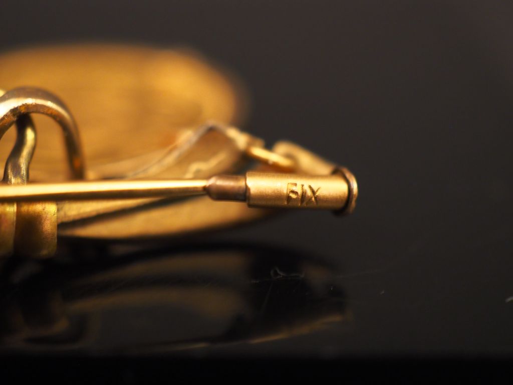 Broche en forme de noeud de ruban en plaqué or, ornée d’une pièce de 20 francs or Léopold II en pendeloque. Poids tel. 8,50 g (environ)