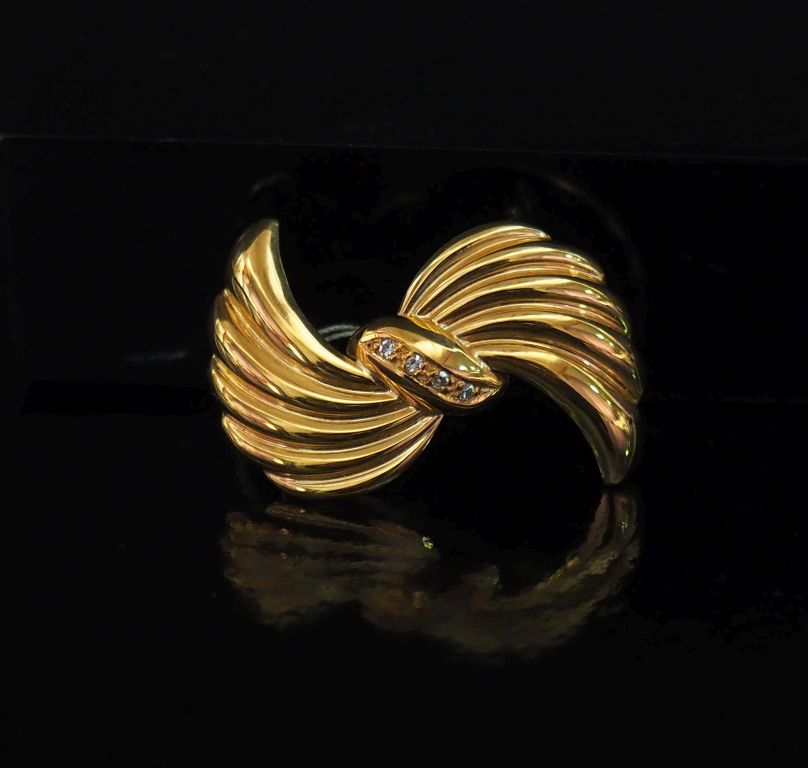 Broche en forme de nœud godronné en or jaune 750, sertie en son centre d'une ligne de quatre petits diamants. 3,2 x 2 cm Poids tel. 2,36 g
