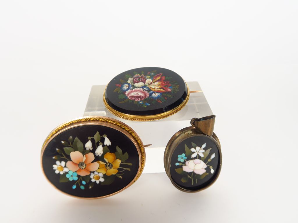 Broche en micromosaique et deux broches en marqueterie de marbre vers 1900.