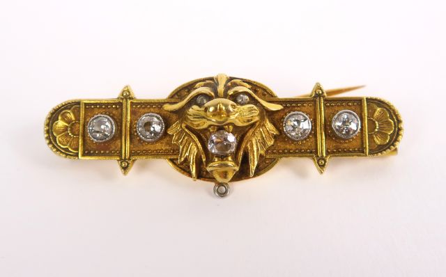 Broche en or à décor de tête de lion, serti de cinq brillants. Poids t...