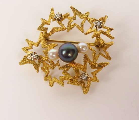 Broche en or à décor d'étoiles stylisées, ornée d'une perle grise épaulée de deux perles de culture, et de quatre petits brillants. Poids tel : 5,4 g tel