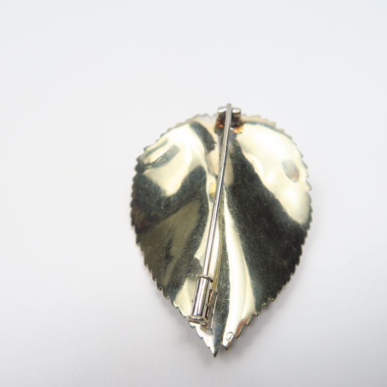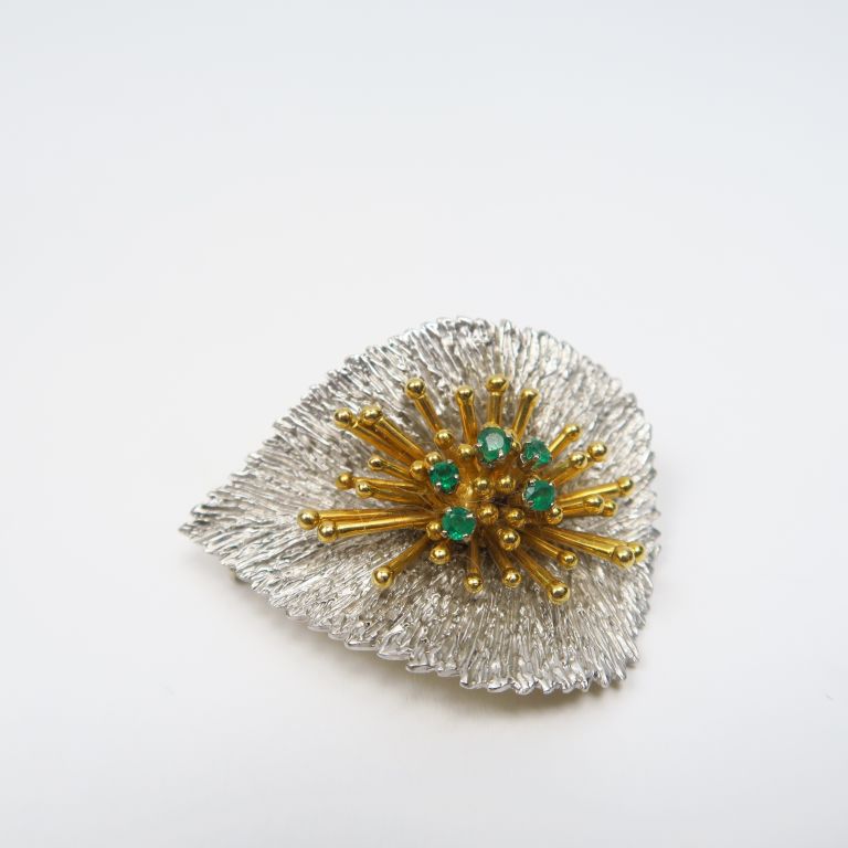 Broche en or deux tons, en forme de feuille rehaussée de cinq petites émeraudes. Poids tel. 25,20 g