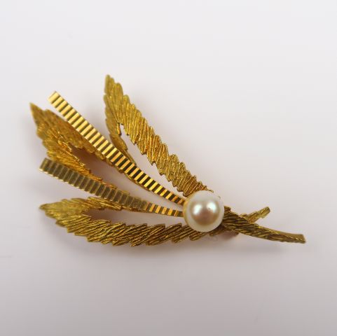Broche en or en forme de branchage, ornée d'une perle de culture. Poids tel : 6,8 g