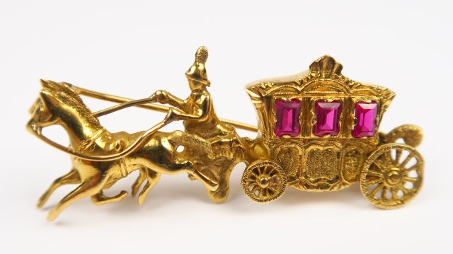 Broche en or en forme de calèche, rehaussé de trois pierres rouges. Poids tel : 15,6 g