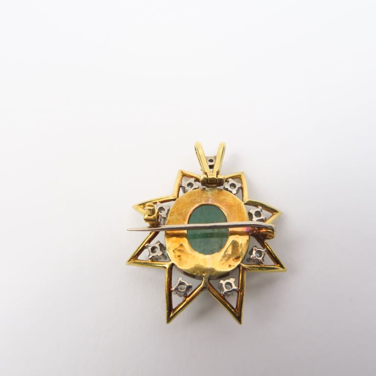 Broche en or en forme d'étoile ornée de huit diamants entourant une émeraude en cabochon. Poids. 9,70 g