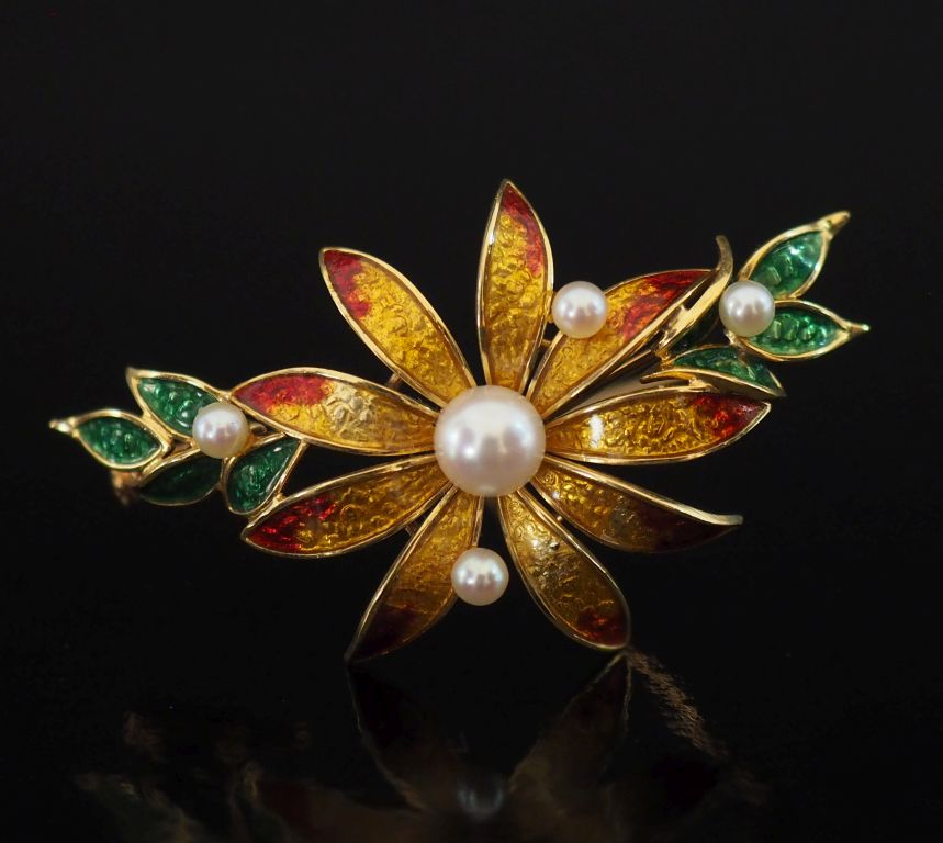 Broche en or jaune 750 en forme de fleur épanouie, rehaussée d'émail jaune, rouge, vert et de perles blanches. 2,7 x 4,5 cm Poids tel. 6,79 g